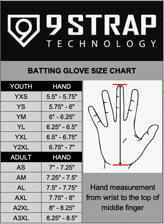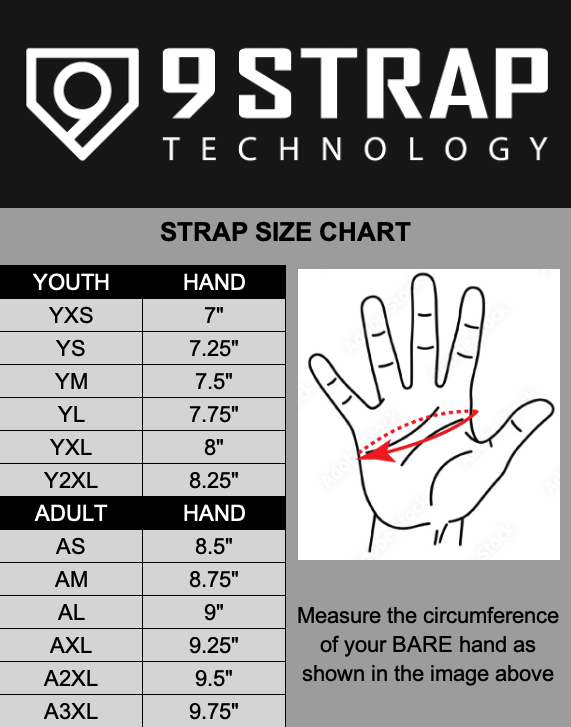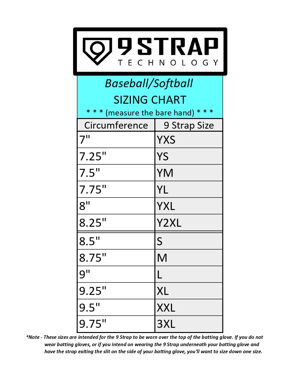 Likewise, if your hand measures at 9", then you'd want to purchase an Adult Large 9 Strap to fit over your batting glove. However, if you do not wear batting gloves, or your batting gloves allow you to wear your 9 Strap on your bare hand and have the strap fit through the slit in the side of the glove, then you'd want to purchase an Adult Medium 9 Strap.